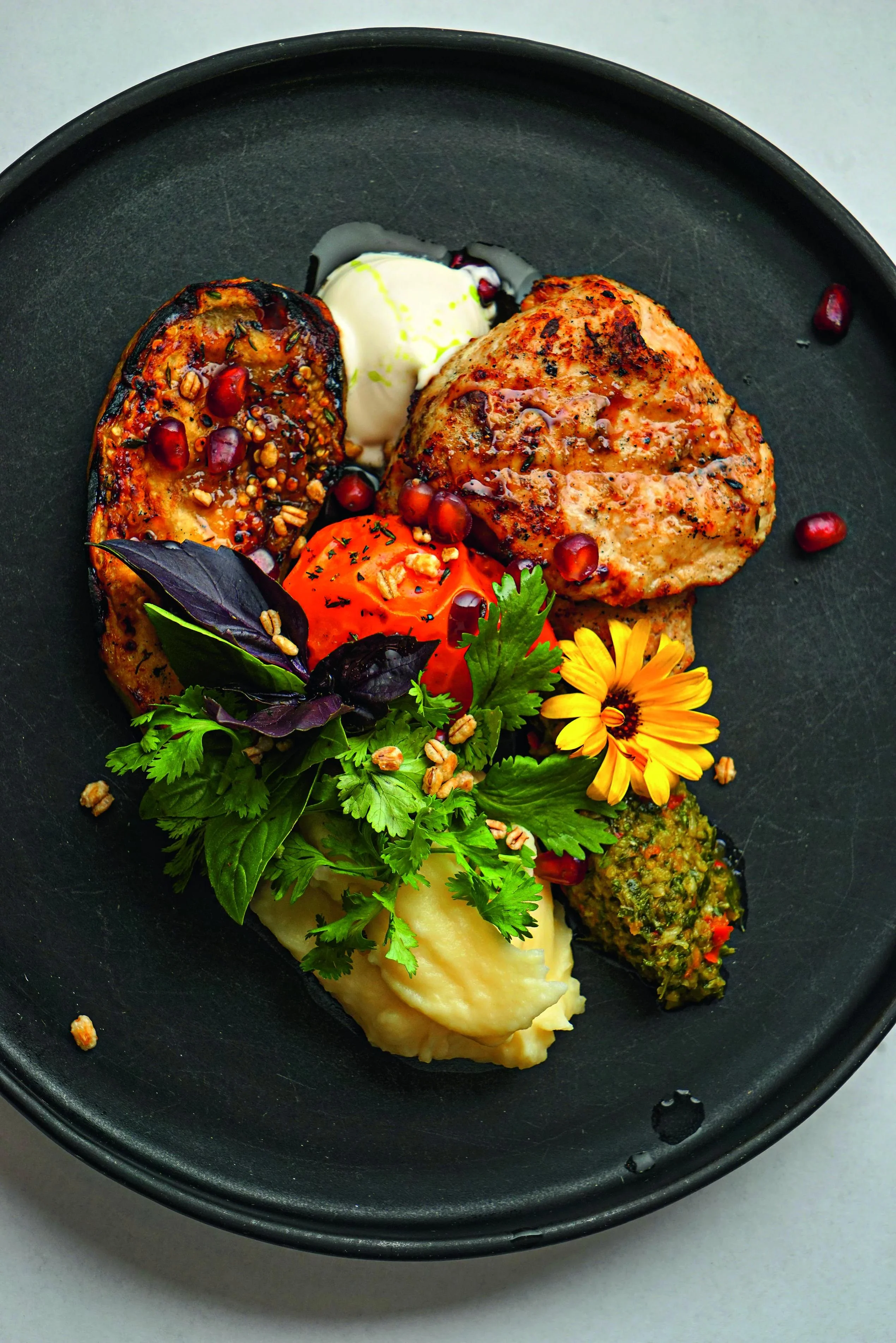 На закуску рекомендую тульскую буррату с цветными томатами с фермы Болотова, соусом из квашеной сныти, молодые яснополянские огурчики из усадьбы Льва Толстого с имбирём, кинзой и мёдом, сливочный сыр халуми с вареньем из шишек. На горячее попробуйте стейк из баклажана на гриле с кремом из сыра фета, травами и бальзамиком из шиповника, медальоны из грудки индейки, маринованной в сметане и травах, с баклажанами на гриле, картофельным пюре и соусом из трав, щучьи котлетки с картофельным кремом, соусом шампань и лёгким овощным салатом. На десерт обязательно возьмите печенье «Орешки из песочного теста» — бомба! — и черемуховый медовик с ежевичным соусом и свежими ягодами.